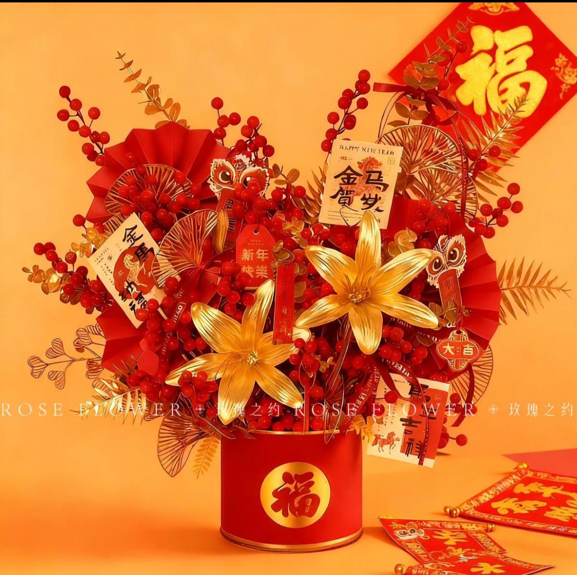 马到功成-30枝仿真冬青混搭福桶新年花束礼物新年礼物送朋友送长辈花店送花上门仿真年宵花